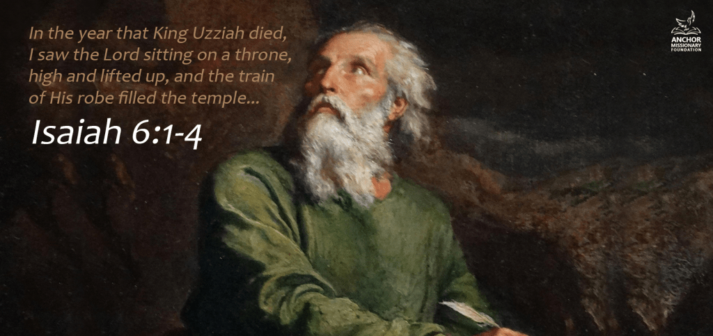 In the year that King Uzziah died, I saw the Lord sitting on a throne, high and lifted up, and the train of His robe filled the temple. Above it stood seraphim; each one had six wings: with two he covered his face, with two he covered his feet, and with two he flew. And one cried to another and said: