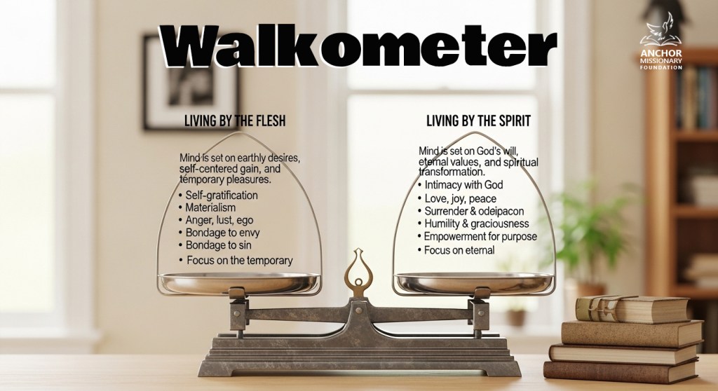 But what exactly are these sinful desires? As I meditated on Romans 8:5, an image came to mind: a weighing scale. On one side—living according to the flesh; on the other—living according to the Spirit. That visual inspired me to call it the “Walkometer”—a personal gauge for how we walk through life and who we allow to shape our steps.